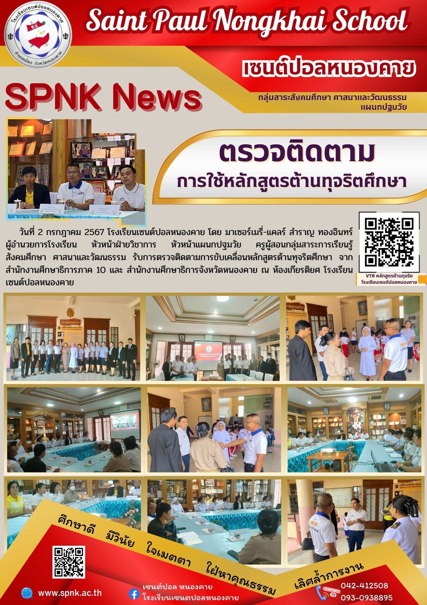 วันที่ 2 กรกฎาคม 2567 โรงเรียนเซนต์ปอลหนองคาย โดย มาเซอร์เมรี่-แคลร์ สำราญ ทองอินทร์ ผู้อำนวยการโรงเรียน หัวหน้าฝ่ายวิชาการ หัวหน้าแผนกปฐมวัย ครูผู้สอนกลุ่มสาระการเรียนรู้สังคมศึกษา ศาสนาและวัฒนธรรม รับการตรวจติดตามการขับเคลื่อนหลักสูตรต้านทุจริตศึกษา จาก สำนักงานศึกษาธิการภาค 10 และ สำนักงานศึกษาธิการจังหวัดหนองคาย ณ ห้องเกียรติยศ โรงเรียนเซนต์ปอลหนองคาย