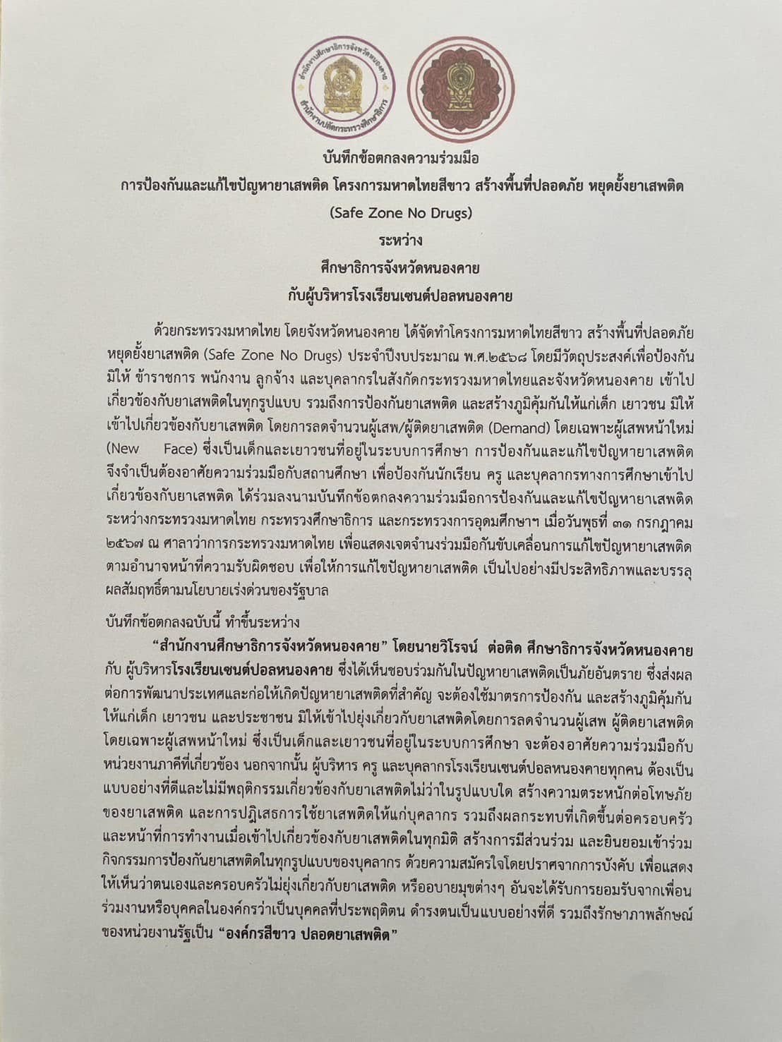 ทองอินทร์ ร่วมลงนามบันทึกข้อตกลงความร่วมมือการป้องกันและแก้ไขปัญหายาเสพติด ระหว่างสำนักงานศึกษาธิการจังหวัดหนองคาย กับโรงเรียนเอกชนในกำกับ ตามโครงการมหาดไทยสีขาว สร้างพื้นที่ปลอดภัย หยุดยั้งยาเสพติด (Safe Zone No Drugs)