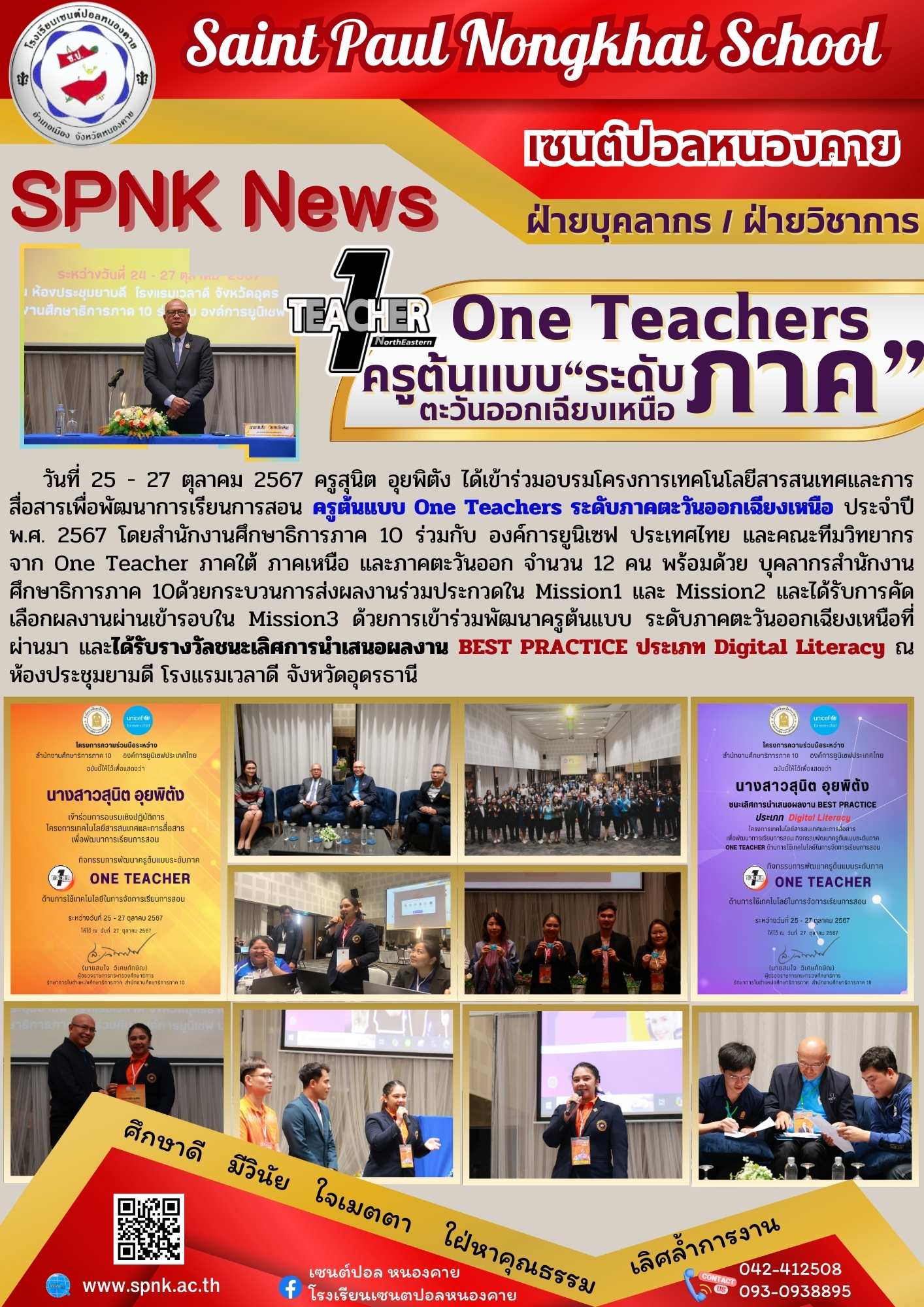 ครูต้นแบบ One Teachers ระดับภาคตะวันออกเฉียงเหนือ ประจำปี พ.ศ. 2567 โดยสำนักงานศึกษาธิการภาค 10 ร่วมกับ องค์การยูนิเซฟ ประเทศไทย และได้รับรางวัลชนะเลิศการนำเสนอผลงาน BEST PRACTICE ประเภท Digital Literacy