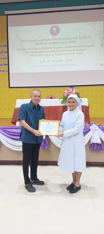 วันอังคารที่ 15 กรกฏาคม 2568 มาเซอร์ เมรี่-แคลร์ สำราญ ทองอินทร์ ผู้อำนวยการโรงเรียนเซนต์ปอลหนองคาย รับเกียรติบัตร การประเมินสุขาภิบาลโรงอาหารในสถานศึกษา ระดับ ดีมาก โดยท่านรองนายกเทศมนตรีเทศบาลเมืองหนองคาย นายวีระชัยโชค มงคลภูมิรัตน์ เป็นประธานพิธีเปิดและมอบเกียรติบัตรสุขาภิบาลโรงอาหารในสถานศึกษา ณ หอประชุมเทศบาลเมืองหนองคาย